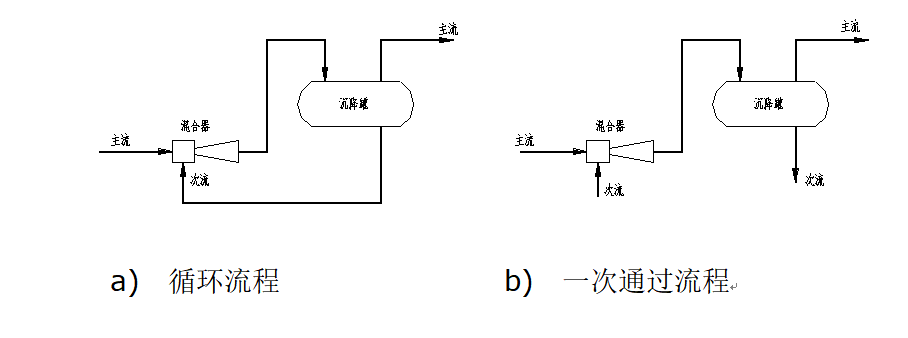 用于酸碱洗涤过程中通常有两种基本流程,如图2.1-2 a)和b)所示。图2.1-2 a)为循环流程,图2.1-2 b)为一次通过流程。炼油厂在油品的碱洗过程中,采用循环流程较多。
