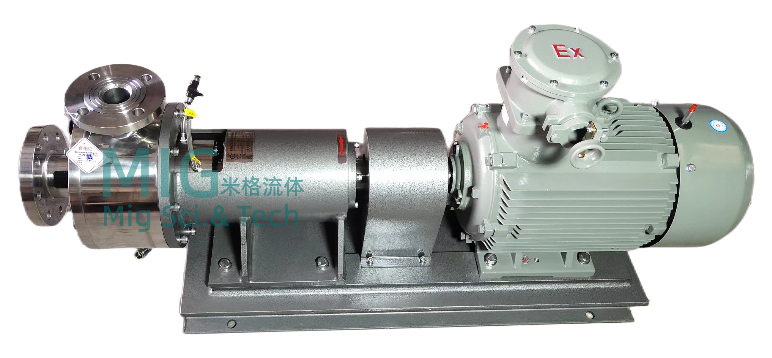 管线式高剪切均质乳化泵的基本工作原理是剪切乳化,依靠两个齿形面的相对运动,其中一个高速旋转,另一个静止,使通过齿面之间的物料受到极大的剪切力及磨擦力,同时又在高频震动,高速离心旋涡等复杂力的作用下使物料有效的分散、均质、乳化。
